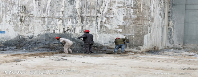 在回轉(zhuǎn)窯,做好更換窯磚前期準備工作——清理深挖4米處窯皮、窯磚。