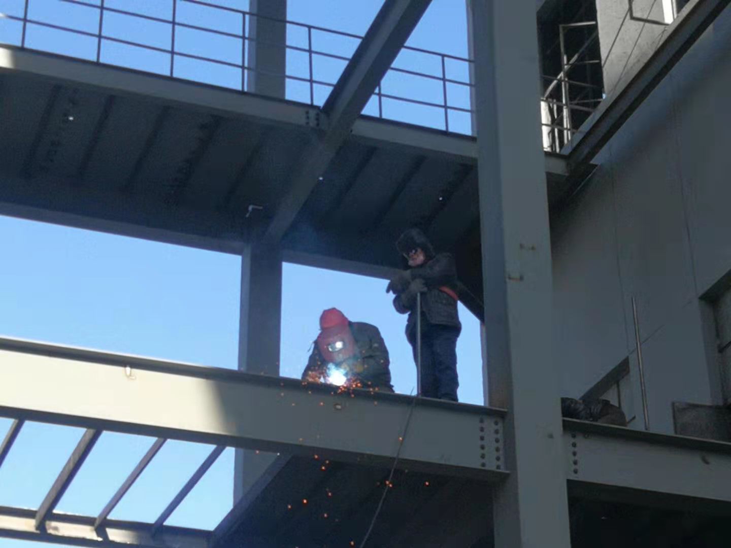 清晨的天,陰沉沉的。雖然跟前幾天比起來溫度有所回升,但呼呼的北風(fēng)還是讓人感覺寒冷。走進技改現(xiàn)場,龐大的吊車正在吊裝作業(yè)。高高的原料輸送斜廊上幾個身影系著安全帶等待著彩板的到來。吊車旁邊的指揮者,穿著厚厚的棉襖,拿著對講機,高高的仰著頭在觀察吊物情況,確保吊裝過程的安全。我抬頭仰望,數(shù)十米高的平臺上,幾個身影若隱若現(xiàn),隱約能看到他們的安全帽在鋼結(jié)構(gòu)后面來回躍動。