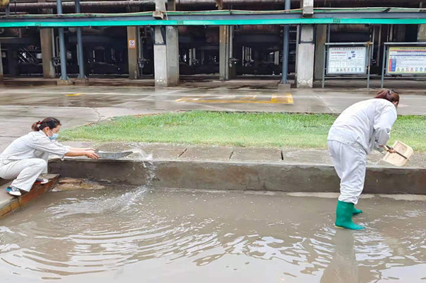 無(wú)論刮風(fēng)還是下雨,天氣有多惡劣 ,總有一群人,她們始終是堅(jiān)守在崗位一線的最美員工,那就是從事質(zhì)檢分析的女工們。其實(shí)在四班三倒的日子里,她們最頭疼的不是工作忙,而是遇見(jiàn)雨雪天氣,特別是下雨天時(shí),出門(mén)去現(xiàn)場(chǎng)取樣就變得困難了很多,有時(shí)候?yàn)榱巳臃奖,她們寧愿選擇不打傘、不穿雨衣,一趟下來(lái),衣服和鞋子差不多全濕透了。這不,那一晚她們就迎來(lái)了一夜的雨,從小雨逐漸變成中雨,聽(tīng)著外面的雨聲,她們?nèi)缱槡,萬(wàn)一變成暴雨可怎么辦,雨一直不停又怎么辦,外面的雨已經(jīng)越下越大,但到了取樣時(shí)間她們不畏困難做好防護(hù)準(zhǔn)時(shí)到現(xiàn)場(chǎng)取樣,她們堅(jiān)信遇到再大困難也要戰(zhàn)勝困難,去完成自己的工作。終于等到了天亮,雨也停了下來(lái),等待她們的就是清理積水?粗敲匆淮笃e水,沒(méi)有抽水泵,這讓她們犯起了難,思考了片刻,她們決定用最老土的辦法使用水桶、笤帚、簸箕清理積水,說(shuō)干就干,水比較深,只好換上了雨鞋,大家分工明確,掃地掃,鏟地鏟,提得提,倒得倒,一會(huì)的功夫積水已經(jīng)少了很多,在大家緊密的配合下,最終把坑里積水全部清理了出去。