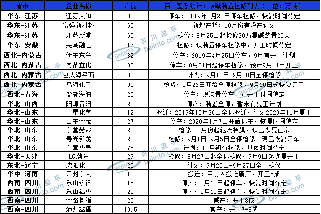 進入9月份我國氯堿裝置開工情況較為平穩(wěn),氯堿檢修企業(yè)較少,開工率維持在78%-81%之間。截止9月10日,中國氯堿裝置具體檢修情況如下圖: